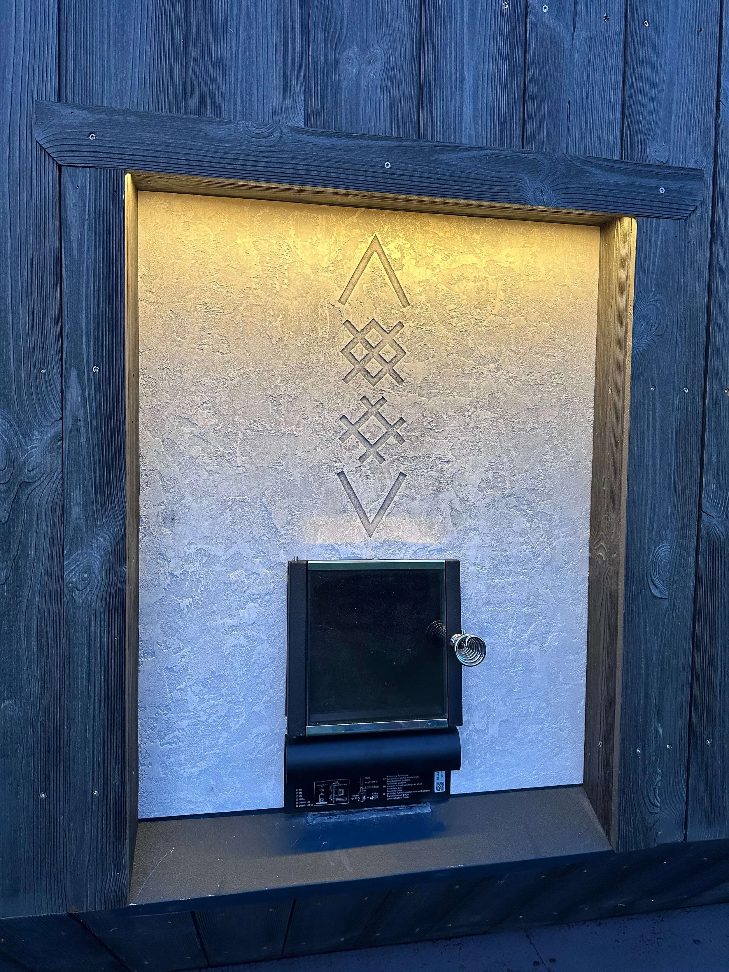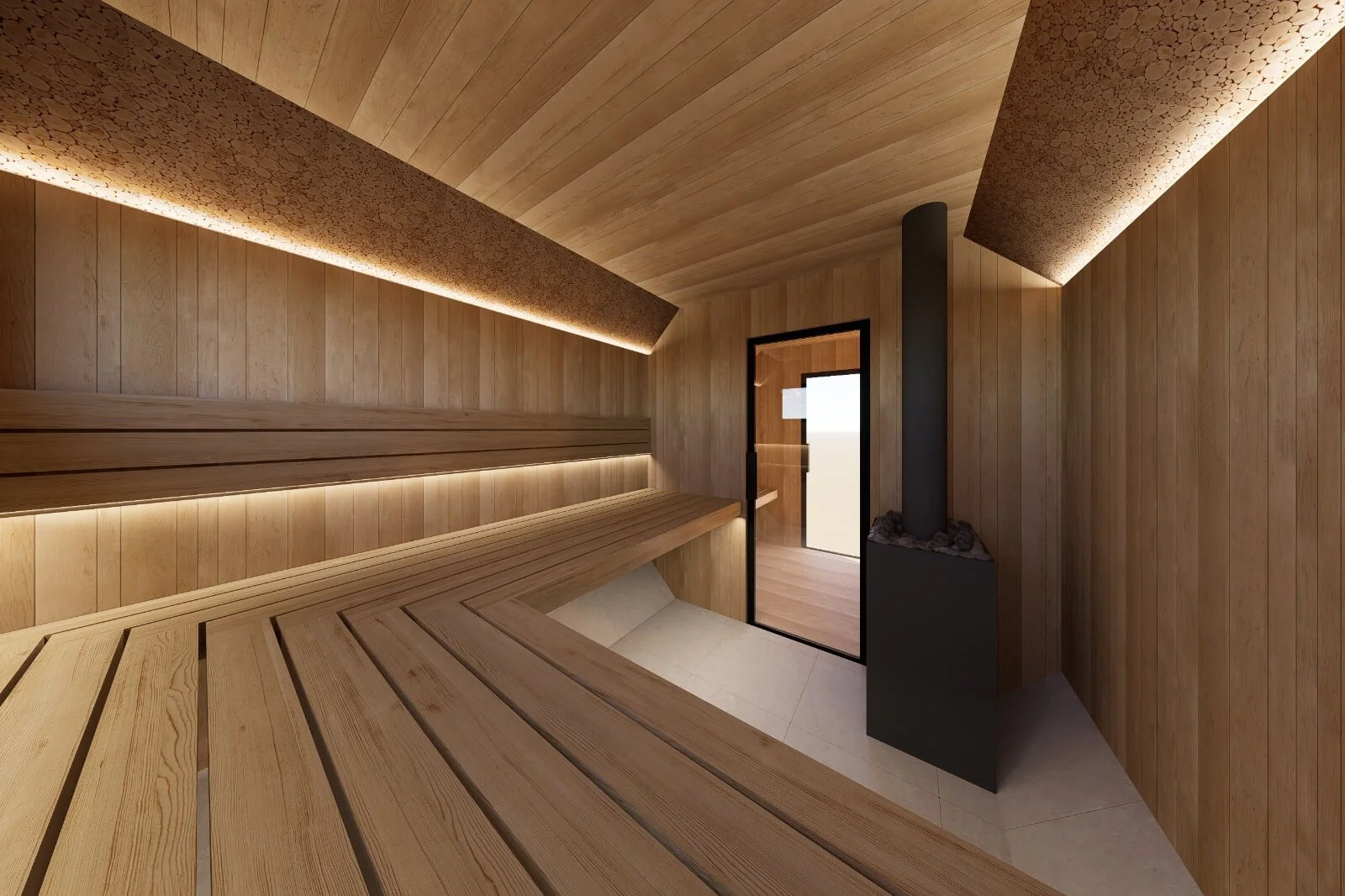 Meticulous handwork, comfortable benches for relaxation and treatments and a wood-burning stove and lounge for peaceful relaxation after the sauna